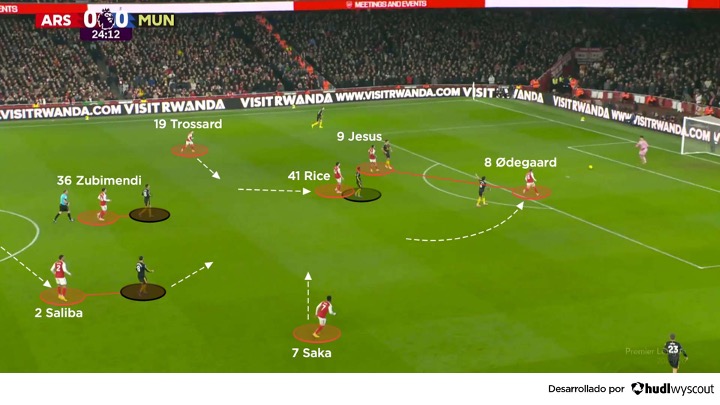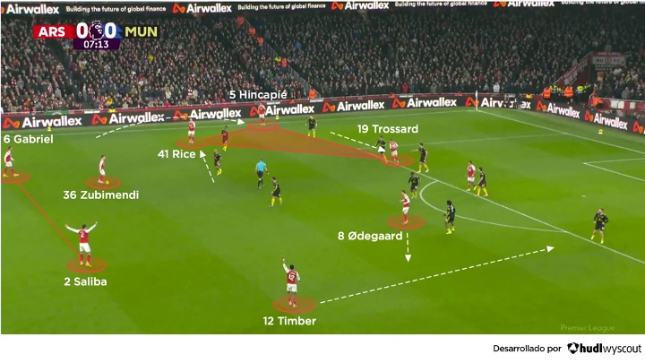 El Arsenal dominó durante la mayor parte de la primera media hora de partido, periodo en el que Declan Rice, Leandro Trossard y Piero Hincapié rotaron por la banda izquierda, arrastrando a Amad Diallo hacia atrás para defender. Zubimendi proporcionaba apoyo por delante de los centrales del Arsenal, estos muy adelantados, lo que ayudó a mantener al Manchester United encerrado en su propio campo.
