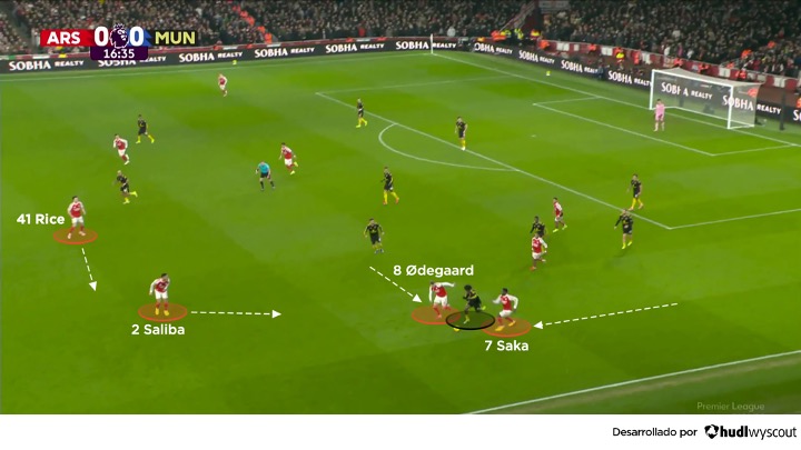 Martin Ødegaard operó sutilmente entre líneas, alternándose entre las zonas centrales y el pasillo interior derecho. Más a la derecha, Timber irrumpía en el área con desmarques desde atrás (abajo), incursionando por el espacio que dejaba por dentro Saka, quien mantenía la amplitud para atacar a Luke Shaw en situaciones de 1 contra 1. Y fueron Saka, Ødegaard y Timber quienes combinaron para crear el primer gol.