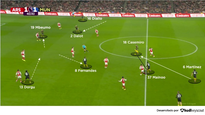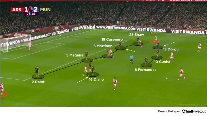 El United comenzó la segunda parte como terminó la primera, es decir, con muchos jugadores por dentro buscando recibir entre las líneas del Arsenal. El conjunto local estuvo impreciso en la posesión, perdiendo el balón con facilidad en algunos momentos en su propio campo. Por parte del United, Dalot y Dorgu continuaron moviéndose hacia el interior, y Martínez siguió alimentando a sus compañeros con pases entre líneas. Mbeumo supo alejarse de los centrales del Arsenal y se asoció con Diallo cuando fue posible, lo que permitió a Fernandes, junto a uno de los pivotes —Casemiro o Kobbie Mainoo—, incorporarse más arriba (abajo). El juego en corto por dentro del United fue clave en su planteamiento ofensivo y precedió a los disparos lejanos del segundo y tercer gol.