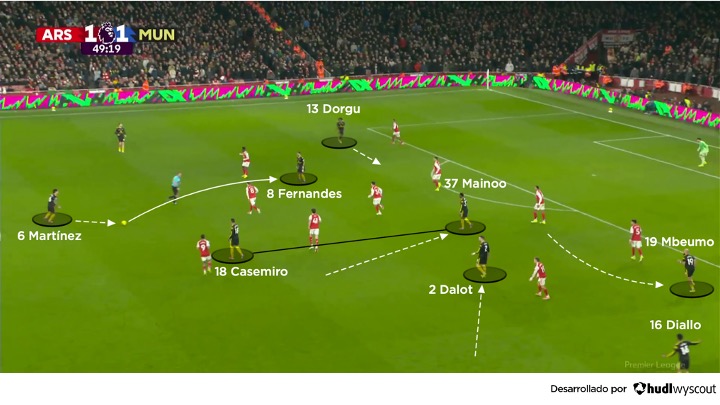 Con el Arsenal ganando 1-0 y, aparentemente, controlando el partido, el United logró igualar el marcador después de que Mbeumo castigara un error de Zubimendi. A partir del empate, el equipo de Carrick buscó situar jugadores por dentro, entre líneas, siempre que fue posible, con el lateral derecho Diogo Dalot moviéndose hacia el interior y Diallo manteniendo la amplitud por fuera. Desde su posición de mediapunta, Fernandes hizo movimientos de arrastre, permitiendo que Patrick Dorgu realizara desmarques interiores desde el sector izquierdo del ataque visitante. Mbeumo generó espacios por dentro alejándose del balón. Y Lisandro Martínez, autor de una buena cantidad de pases verticales, habilitó con frecuencia a los pivotes del United (abajo), quienes a su vez combinaron con acierto con los compañeros que tenían por delante, ayudando al equipo a tener periodos sostenidos de posesión.
