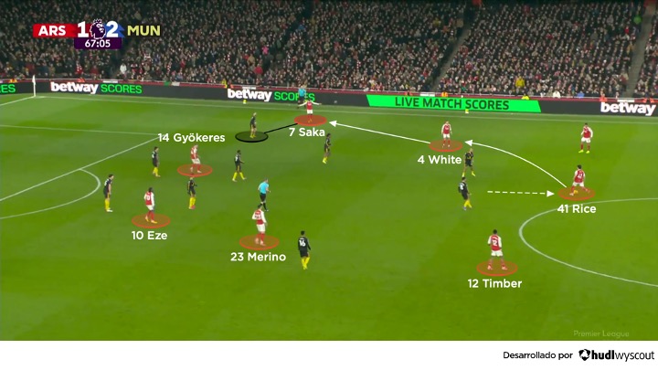 Arteta realizó cuatro cambios justo antes de la hora de juego en un intento de reactivar el ataque del Arsenal, con Eze, Merino, Gyökeres y Ben White entrando por Zubimendi, Ødegaard, Gabriel Jesus e Hincapié. Eze y Merino se movieron alrededor de Gyökeres, con Rice bajando metros. El lateral derecho Ben White, por su parte, asistió a Saka en su continuo duelo 1x1 con Shaw, y Timber se desplazó al lateral izquierdo (abajo), un movimiento que anuló su aportación ofensiva. El United optó entonces por defender en un bloque bajo, con el mediocampo extremadamente compacto, obligando al Arsenal a circular por fuera, desde donde los visitantes tuvieron que defender centros y saques de esquina.