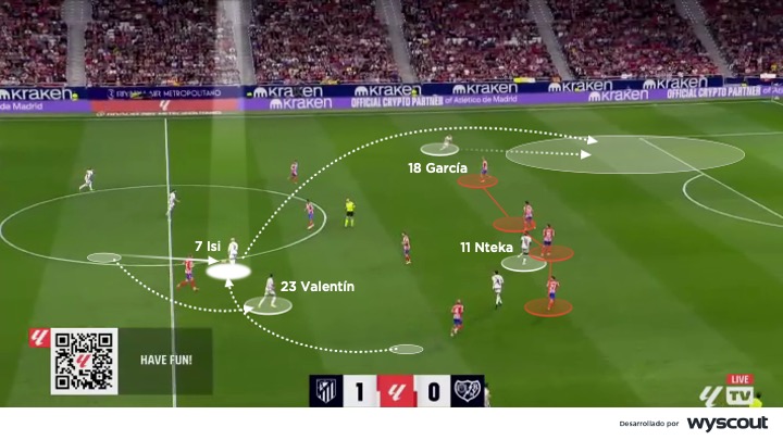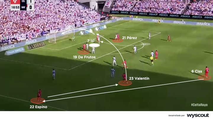 La estructura ofensiva del Rayo no se limita a progresar con verticalidad, sino que convierte esa movilidad en una ocupación racional del área que maximiza las opciones de remate.