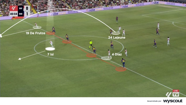 Asimismo, ese mecanismo puesto en práctica ante rivales como el Barcelona facilita también activar una segunda vía ofensiva: si el rival bascula para tapar el pase a Isi, libera la carrera interior de Díaz o la irrupción desde segunda línea de Fran Pérez. La inteligencia posicional de Isi, combinada con la potencia física de Alemão y la movilidad de los extremos, proporciona al Rayo un ataque coral, imprevisible y capaz de generar ventajas no solo por acumulación de jugadores, sino por manipulación táctica del rival. Aquí demuestra una evolución del modelo heredado de Iraola hacia un sistema más sofisticado en la explotación de los espacios intermedios y profundos.
