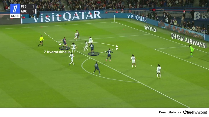 Desde que se incorporó al PSG, Kvaratskhelia ha seguido siendo una amenaza ofensiva, especialmente a través de su desborde. Resulta particularmente peligroso cuando parte desde estático. En estas acciones, su orientación corporal no siempre sugiere que vaya a arrancar en conducción, ni siquiera que esté preparado para hacerlo. Esto le permite atraer y fijar a su rival antes de explotar su velocidad. Cuando se abre un espacio, es capaz de acelerar y atacarlo, buscando imponerse a su marcador directo en el uno contra uno.