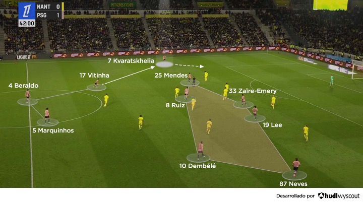Este es un rol que podría asumir con mayor frecuencia en el futuro, ya que el lateral izquierdo del PSG, Nuno Mendes, se siente muy cómodo proporcionando amplitud. Dembélé también posee amplia experiencia en las bandas, lo que facilita el intercambio de posiciones con Kvaratskhelia. En cambio, Gonçalo Ramos es un delantero centro más fijo, y aunque el georgiano puede asociarse con él por dentro, tenderá a permanecer más tiempo en la banda.