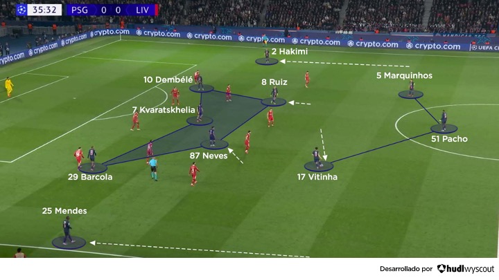 Los movimientos e intercambios de posiciones variados e impredecibles en la banda derecha del PSG suelen atraer al bloque rival hacia ese lado. A partir de ahí, los pases rápidos o los cambios de orientación encuentran a Kvaratskhelia aislado en la izquierda, listo para avanzar, normalmente en acciones de uno contra uno.
