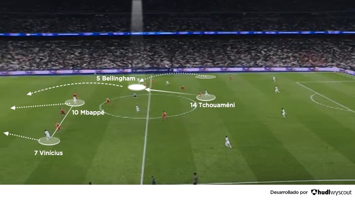 El punto de inflexión llegó con los cambios. Con 0-2 en contra y cerca del KO, la entrada de Jude Bellingham en el Real Madrid transformó el mediocampo, aportando presencia física, capacidad de presión y lectura de la segunda jugada. Junto a él, Brahim Díaz (que entró por Arda Güler) añadió dinamismo entre líneas y capacidad para girar en espacios reducidos. El Real Madrid pasó a comportarse con más agresividad, defendiendo hacia delante y reduciendo distancias entre líneas. Con los cambios, la estructura blanca mutó en un 4-4-2 más activo, con mayor capacidad para recuperar en campo rival y atacar (abajo).