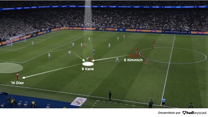 En el ataque del Bayern, cada movimiento estaba conectado: Harry Kane descendía para generar superioridad entre líneas, fijar a los centrales y liberar espacios (abajo); Luis Díaz y Serge Gnabry atacaban la espalda con rupturas diagonales; Kimmich organizaba desde la base con criterio y pausa. El Bayern no era un equipo que necesitara acelerar constantemente, porque siempre estaba bien posicionado.