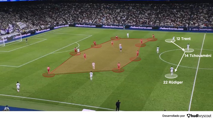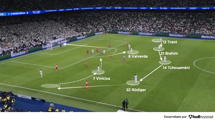 El Bayern, por su parte, empezó a perder continuidad. Su intensidad en la presión bajó ligeramente y el equipo dejó de presionar con la misma altura que había mantenido hasta entonces. Ese pequeño ajuste cambió el contexto del partido: el Real Madrid encontró más tiempo para salir jugando, más espacio entre líneas y más opciones para instalarse en campo rival (abajo).