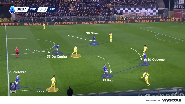 Los desmarques por los pasillos interiores también han sido útiles cuando el centro del campo está excesivamente congestionado (abajo). Aunque los pases y desmarques en diagonal del Como no siempre logran superar la línea defensiva, sí son progresivos y con intención. De hecho, en la temporada 2024/25 de la Serie A, fue el quinto equipo en mayor cantidad de pases progresivos dados.