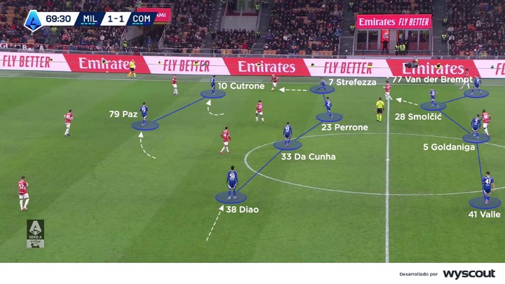 No obstante, ese movimiento en particular también ofrece ventajas en la fase ofensiva, ya que favorece que ambos laterales avancen mientras el Como construye la salida con una defensa de tres hombres compuesta por el pivote que desciende y los dos centrales. Más adelante, la base del mediocampo vuelve a ser ocupada por un pivote (ahora Caqueret en el ejemplo de abajo), con un extremo de un lado desplazándose hacia dentro y el mediapunta ajustándose por fuera. De este modo, el Como forma un rombo que ocupa la zona central con muchos jugadores (abajo), para combinar y recibir pases en profundidad entre líneas desde la línea de tres defensores.