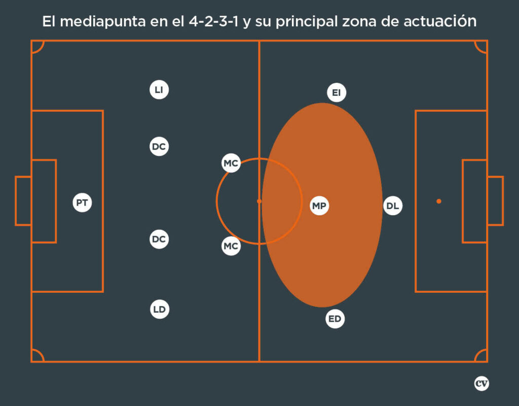 El mediapunta también actúa como enlace entre los pivotes, los extremos y el delantero. En un 4-2-3-1, los dos pivotes deben hacer llegar el balón por el carril central hasta el mediapunta, para que este jugador pueda recibir lo más adelantado posible, cerca de los pivotes rivales y por detrás de la línea de mediocampo contraria. Para generar esa línea de pase, necesita una excelente capacidad de movimiento y posicionamiento, sabiendo encontrar los espacios libres entre las líneas defensivas rivales y ocuparlos con eficacia.