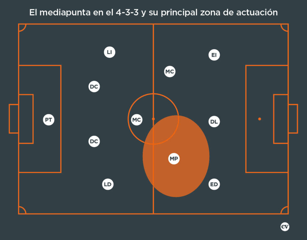 El mediapunta en un 4-3-3 asume un papel más amplio que en otros sistemas. No solo es generador de juego de ataque, sino que participa activamente en todas las fases, con mayor movilidad, ya que puede intervenir desde carriles exteriores o interiores.