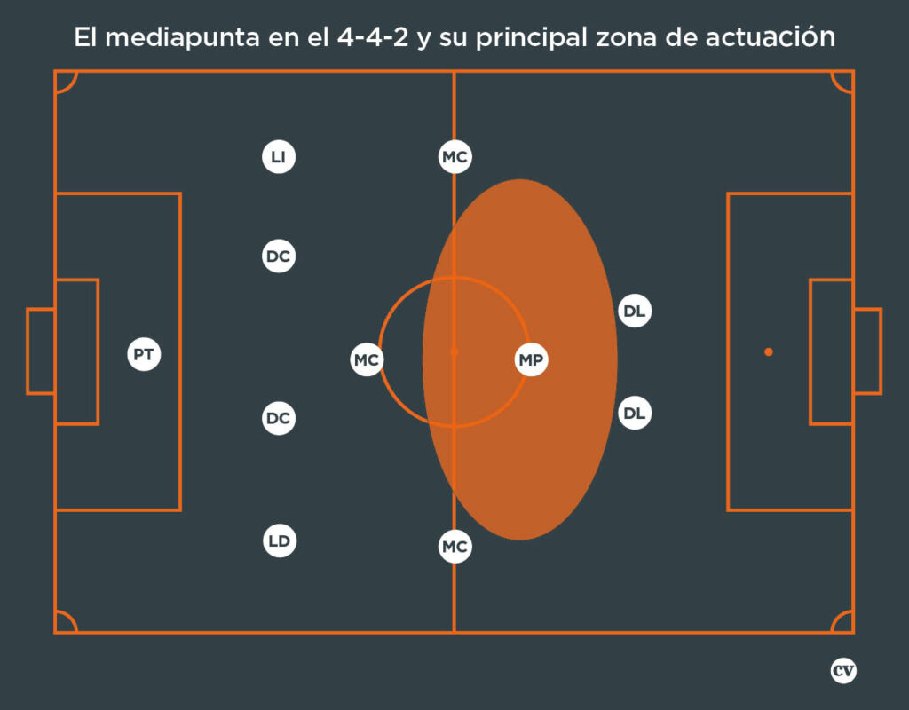 La figura del mediapunta se define como la de un atacante que actúa en los espacios comprendidos entre el centro del campo y la delantera. Suele recibir el balón en la zona ubicada entre la línea de medios y la defensa rival, conocida habitualmente como "entre líneas".