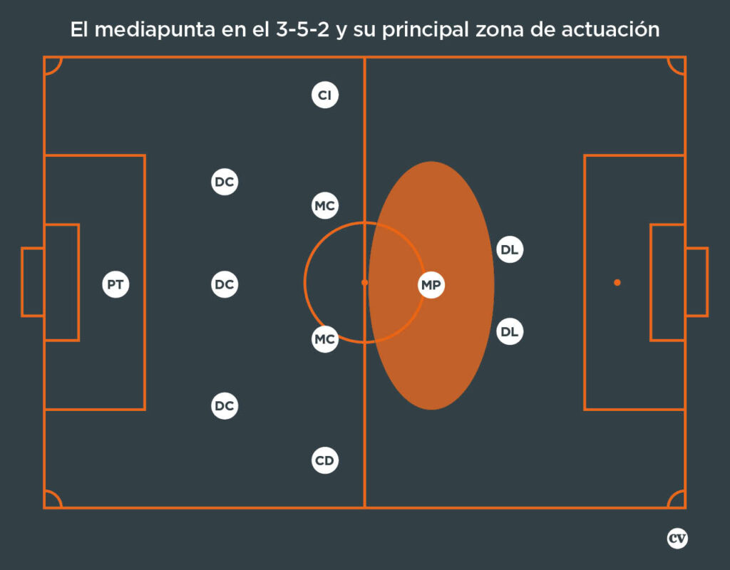 En fase ofensiva en un 3-5-2, el mediapunta necesita una visión periférica amplia para detectar espacios en el carril central, la zona de mayor congestión. Debe aprovechar la movilidad del pivote rival cuando este se desplace hacia los costados. De esta forma, ocupa el espacio libre, zona donde podrá ser encontrado directamente o mediante tercer hombre. Este movimiento de apoyo como segundo punta convierte al mediapunta en un jugador que explora y aprovecha las conexiones creadas por su equipo.