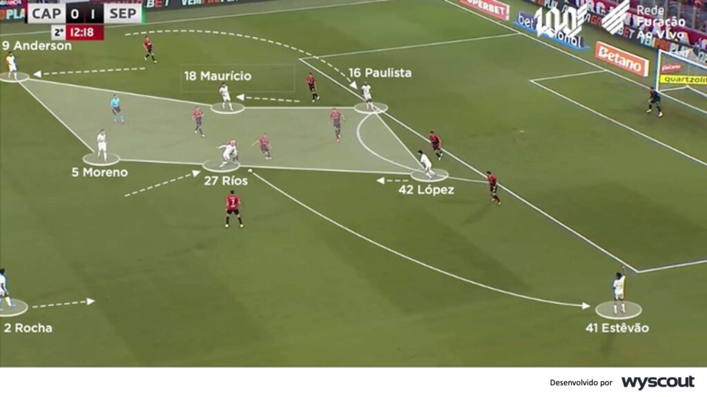 Com os jogadores do lado esquerdo do Palmeiras se deslocando para invadir por dentro e ao redor da área, Estêvão tinha opções para fazer cruzamentos, assim como passes potentes para companheiros no centro da área ou na segunda trave. Ele também podia executar passes para trás, visando a dupla de volantes, atacantes recuados ou o lateral-esquerdo que avançara à espera de uma bola na entrada da área.