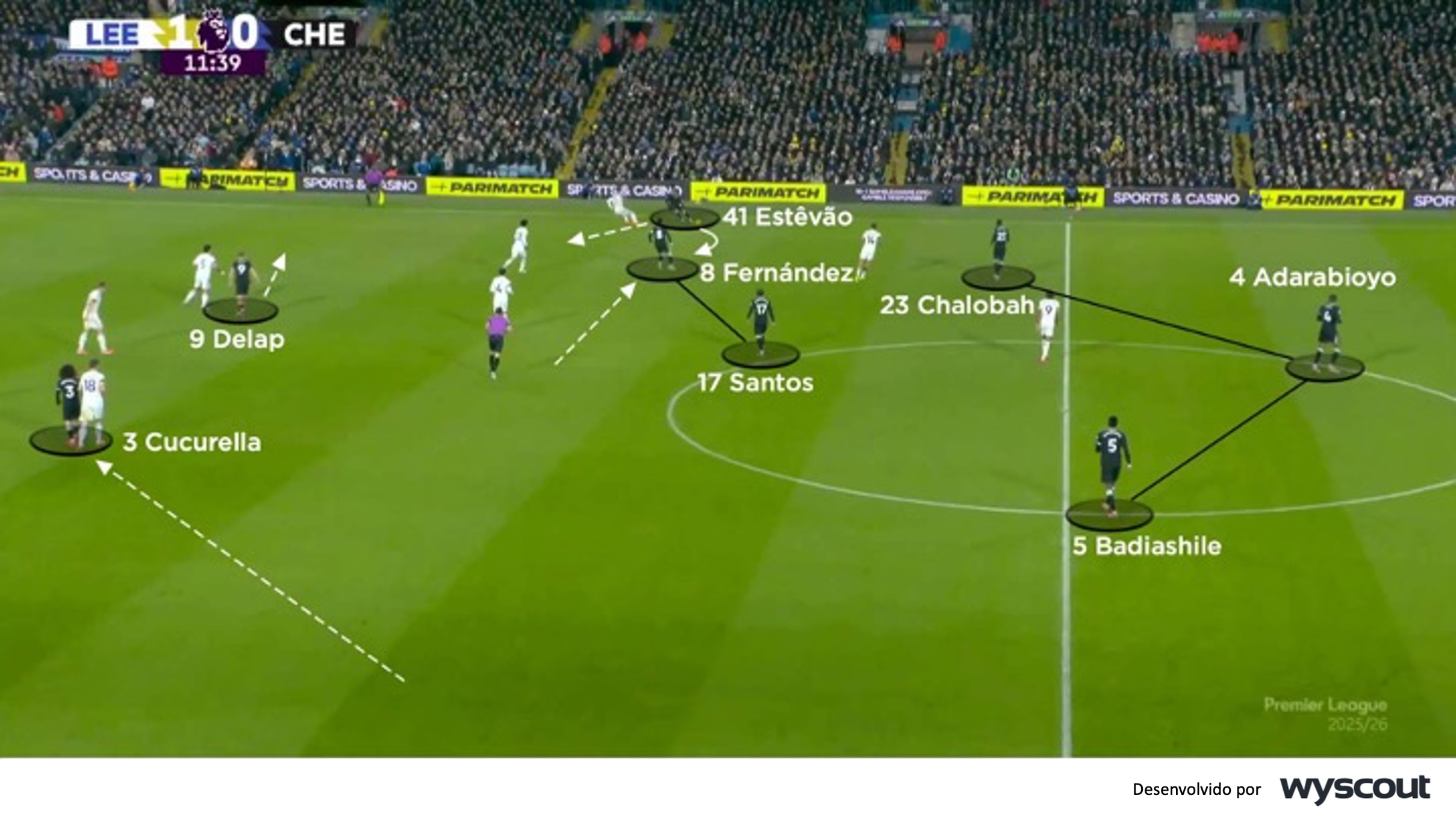 No Chelsea, Estêvão vem tendo mais oportunidades de passar a bola para companheiros que atacam a área. Ele também tem tido a oportunidade de fazer tabelas mais recuadas no terreno de jogo, especialmente quando o lateral adversário avança para pressionar. Mesmo assim, ele continua tendo muitas oportunidades de driblar e atacar diagonalmente em direção ao gol. E com um centroavante, dois meias-atacantes e um ponta pelo lado oposto prontos para atacar a área quando ele avança, ele tem tido opções para dar assistências com seus cruzamentos, que podem ser enviados com efeito para o primeiro ou segundo postes, especialmente para o meia-atacante e o ponta do lado oposto.