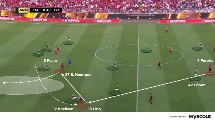 Flamengo encontró un resquicio del que aprovecharse cuando detectó que la última línea de Palmeiras no coordinaba bien sus saltos defensivos sobre los apoyos exteriores. Filipe Luís diseñó un patrón repetido que generaba una superioridad: Bruno Henrique se desplazaba al carril izquierdo para recibir en apoyo, fijando a Khellven y haciéndole dudar entre saltar o mantener su posición. Ese movimiento alteraba todo el ecosistema defensivo de Palmeiras.