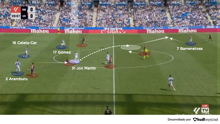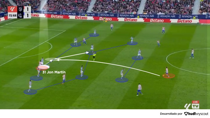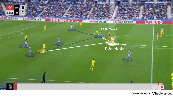 El impacto de Jon Martín se amplifica cuando se analiza su comportamiento dentro del sistema colectivo. En la Real Sociedad de Matarazzo, donde se alternan estructuras como el 4-2-3-1 con balón y salidas de tres junto a Caleta-Car, Gorrotxategi y Remiro cuando la primera línea rival no está en posiciones avanzadas, su capacidad para interpretar diferentes escenarios es fundamental, ya que la prioridad de Matarazzo es que Jon Martín sea el enlace entre el inicio del juego y la creación debido a su seguridad en el pase, su visión para encontrar al jugador libre y su ubicación sobre la pierna dominante (abajo).