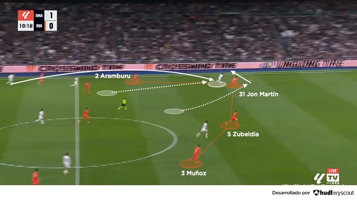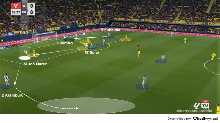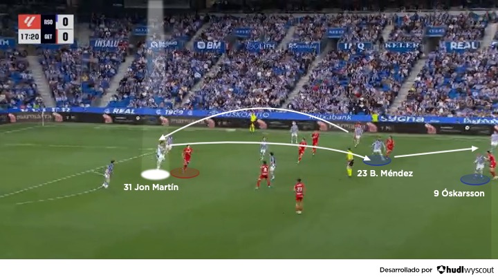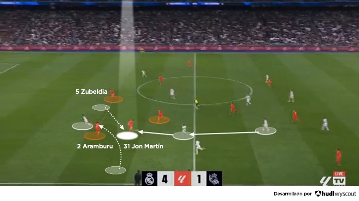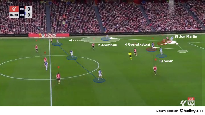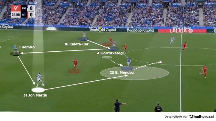 En fase ofensiva, Jon Martín se integra con naturalidad en los mecanismos de salida de la Real Sociedad dentro del 4-2-3-1 o el 4-4-2. Ubicado habitualmente como central derecho, actúa como un primer organizador que facilita la progresión en el inicio del juego, ya sea como primer receptor o como tercer hombre, con la participación del portero Álex Remiro, Soler o Gorrotxategi en apoyo para salir por el sector derecho (abajo). Su principal virtud no es la espectacularidad, sino la claridad en la toma de decisiones: entiende cuándo asegurar la posesión y cuándo acelerar el juego con un pase vertical.