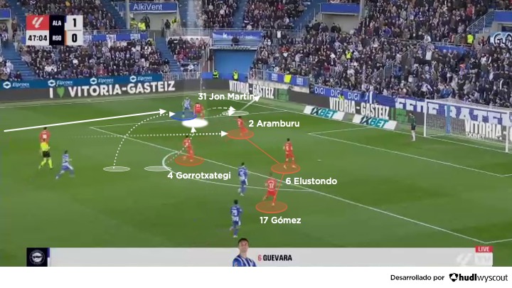 Su gestión del ritmo es clave para el equilibrio del equipo. No precipita las acciones ni las ralentiza innecesariamente, sino que adapta su comportamiento al contexto que demanda la acción concreta o el propio partido. Además, su precisión en el pase le permite conectar con mediocentros para superar la primera línea de presión rival o realizar paredes para atraer rivales y liberar a Jon Aramburu por el flanco derecho, activándole en amplitud y en ventaja para hacer llegar el balón a los tres mediapuntas ya en campo rival.