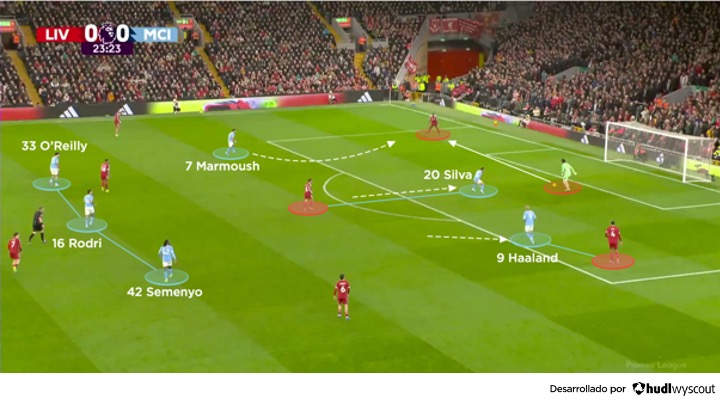 El Manchester City usó un 4-4-2 en rombo para presionar arriba la salida desde atrás del Liverpool. Haaland se posicionó en el perfil derecho, incentivando los pases hacia Konaté. Marmoush se unía entonces a Haaland en la primera línea de presión, impidiendo que el balón se jugara por el centro y haciendo que el cuero viajase hacia las bandas si era necesario. A partir de ahí, Nico O’Reilly saltaba para presionar cualquier pase a los costados, mientras que el resto del bloque del City basculaba para mantener un 3 contra 3. Semenyo apoyaba esta acción, dejando libre a Kerkez, pero garantizando que el City siguiera teniendo tres jugadores en el centro del campo pese a que O’Reilly saltara hacia la banda (abajo).