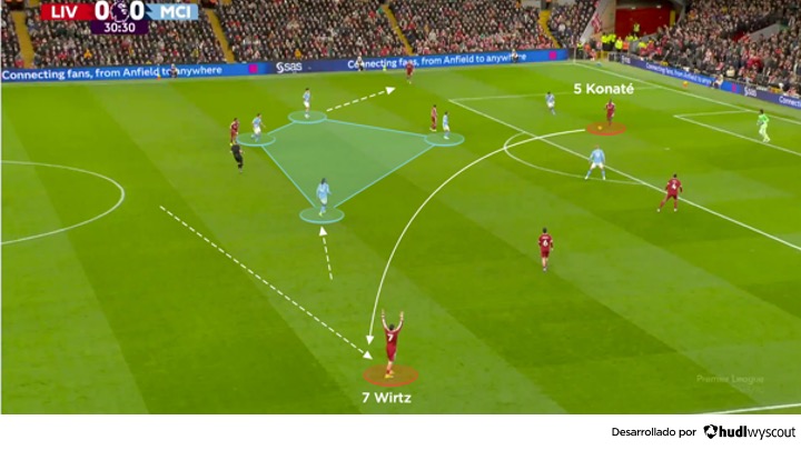 En respuesta a la presión del Manchester City, el Liverpool estiró su centro del campo lo máximo posible. Esto implicó que Florian Wirtz se moviera hacia la izquierda, aprovechando la posición defensiva de Semenyo por dentro. El Liverpool podía entonces cambiar el juego de derecha a izquierda, alejándose de la trampa de presión que intentaba el City, para conectar con su tridente ofensivo, que, a decir verdad, no tuvo mucha presencia en la primera mitad. A menudo, este intento de conexión con los tres de arriba, ubicados muy arriba y muy abiertos, desembocó en pases complicados hacia Wirtz (abajo).