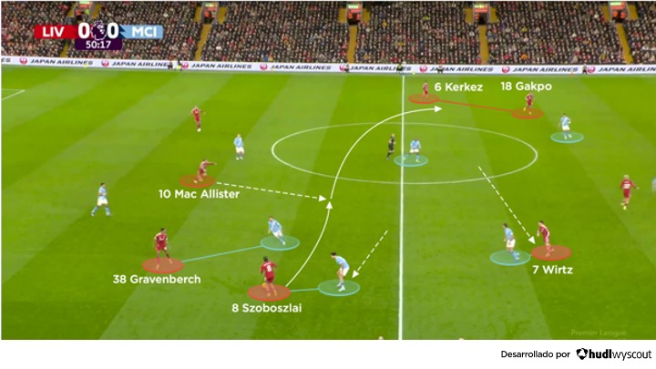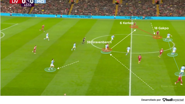 En la segunda mitad, Wirtz se desplazó hacia la banda derecha del ataque del Liverpool, dando apoyo Szoboszlai —todavía presionado por O’Reilly— y a Mohamed Salah. Allí, atrajo la atención de Rodri, impidiéndole asociarse con Bernardo Silva para cubrir a los mediocampistas más retrasados del Liverpool, Ryan Gravenberch y Mac Allister. El rol defensivo de Semenyo dejó de tener sentido debido a la nueva posición de Wirtz, y los locales construyeron su salida por ese lado para luego buscar a Kerkez por el otro costado. Una vez ahí, la intención del Liverpool pasaba por atacar con Gakpo, a menudo en un 2 contra 1 frente a Nunes (abajo).