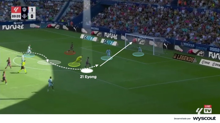En situaciones de ataque organizado o posicional, Etta Eyong asume el rol de pivote ofensivo. Aquí, fija su posición entre centrales para comprimir la última línea rival y liberar así los pasillos interiores, facilitando la progresión del equipo. Sus desmarques circulares en zona de finalización, rompiendo entre el intervalo central y lateral, son una constante en la estructura de posesión del Levante.