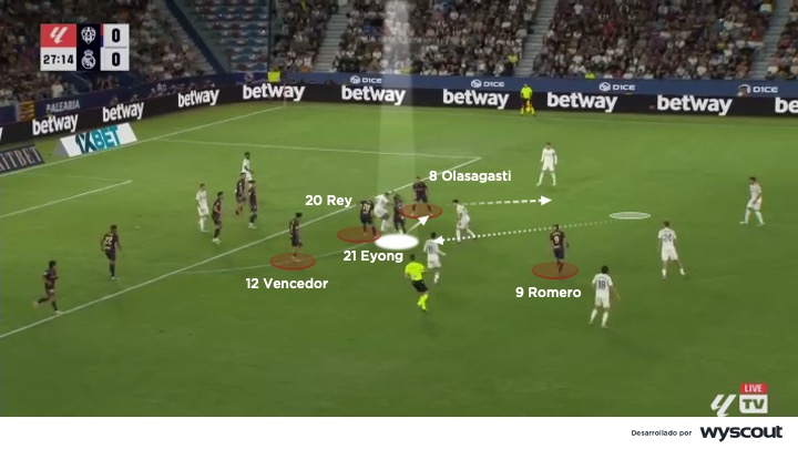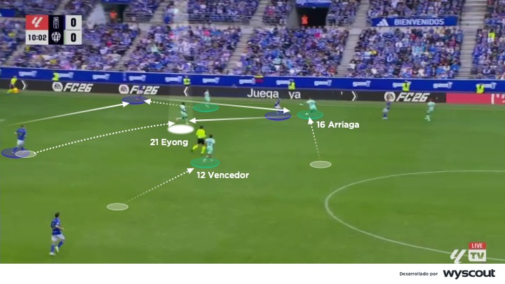 Sin balón, Eyong es un delantero que inicia la presión no por ímpetu, sino por inteligencia. En situaciones de bloque alto de su equipo orienta la salida rival hacia la banda, cierra la línea de pase al pivote (abajo) y coordina el salto con los mediocentros —Unai Vencedor, Oriol Rey o Kervin Arriaga— y los extremos —Carlos Álvarez o Roger Brugué—. Su lectura para saltar a la presión en el momento exacto le permite activar una presión sincronizada. Esta precisión evita desgastes innecesarios y mantiene la profundidad defensiva del bloque.