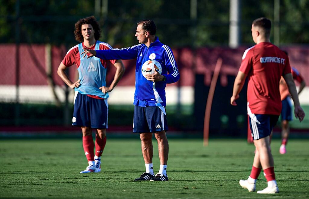 El cambio no tenía que ver solo con el sistema, también buscaba sacar a los jugadores de su zona de confort. Llevaban muchos años jugando con un sistema similar, lo que naturalmente genera algunas reacciones automáticas en el campo. Quería que los jugadores viviesen situaciones nuevas, es decir, timings y espacios diferentes y nuevas dinámicas de exigencia. A medida que los jugadores progresan deben desarrollar adaptabilidad. Ese era nuestro objetivo. Hoy me enorgullece ver que los principios y las formaciones tácticas relacionadas con ese modelo aún se utilizan en la academia del Olympiacos.