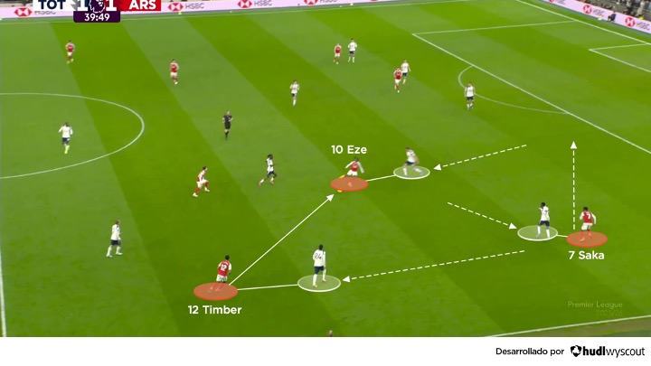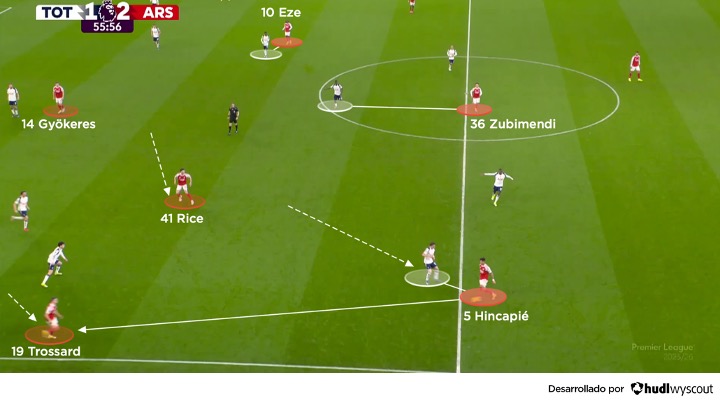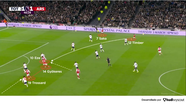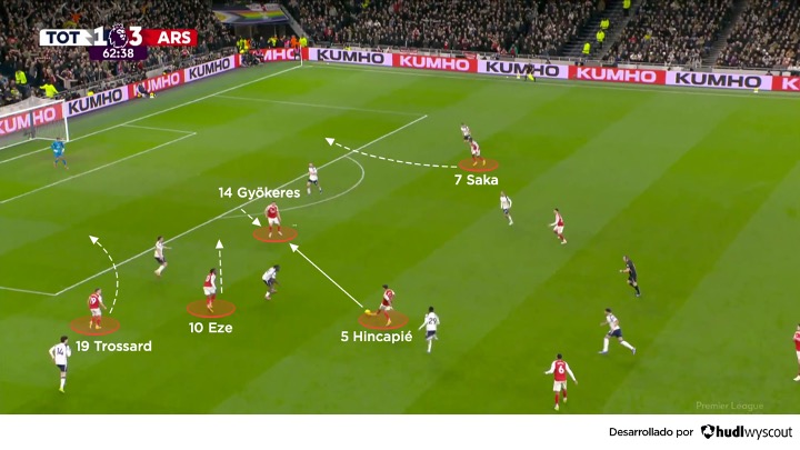 Para atacar la línea de cinco defensores del Tottenham en bloque bajo, el Arsenal trató de asociarse en banda con lateral y extremo para superar a los carrileros locales. En el perfil derecho, Bukayo Saka y Jurriën Timber; en el izquierdo, Leandro Trossard junto a Piero Hincapié. Ambas sociedades del Arsenal generaron movimientos de desdoblamiento y jugaron a diferentes alturas para, posteriormente, buscar el centro hacia los jugadores de segunda línea.