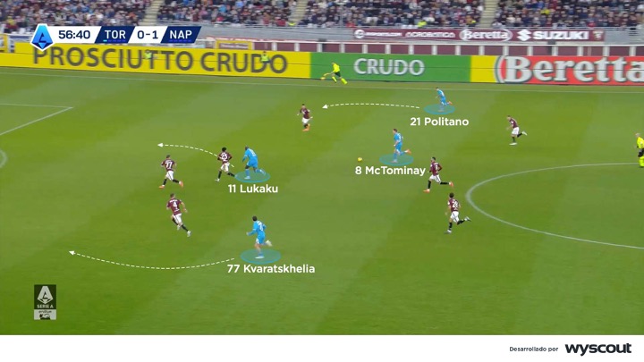 En este caso, Scott McTominay avanza con el balón para aprovechar el espacio generado por la línea defensiva del Torino, que retrocede intentando frenar el progreso del Napoli. Matteo Politano y Khvicha Kvaratskhelia apoyan desde los costados, fuera de los laterales del Torino, generando la amplitud necesaria para acelerar el ataque con velocidad y dinamismo.