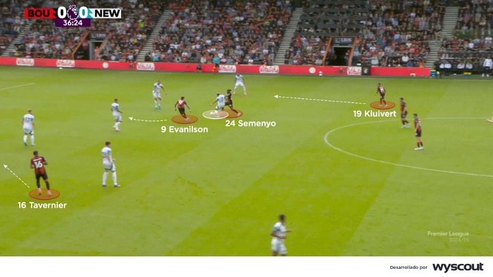 Un ejemplo de las transiciones del Bournemouth se pudo ver en el partido que disputaron ante el Newcastle (abajo). En él, el equipo de Iraola saltó a la presión sobre Joelinton, obligándole a jugar de espaldas. Antoine Semenyo aprovechó ese momento para intensificar la presión y recuperar el balón en zona alta, iniciando una peligrosa transición ofensiva. Justin Kluivert y Marcus Tavernier ofrecieron amplitud en los costados, mientras que Evanilson realizó un desmarque entre los centrales rivales, abriendo espacio para que Semenyo avanzara hasta el área y centrara raso. Tavernier culminó la jugada llegando al segundo palo antes que la línea defensiva rival.